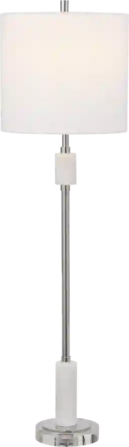 Showcasing a transitional elegance, the Genesee Lane buffet lamp features a plated polished nickel finish with sophisticated white marble details and a thick crystal foot. The lamp is paired with a white linen hardback drum shade. Partial assembly may be required.