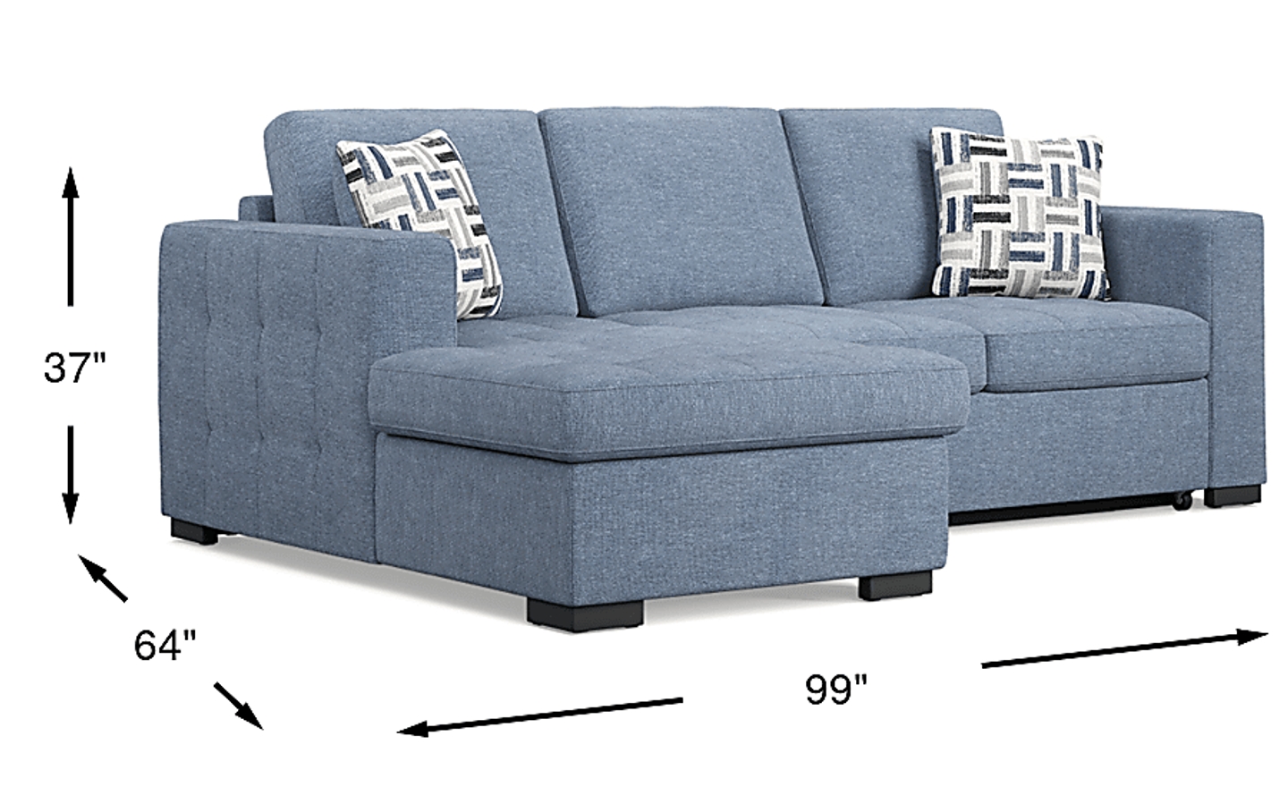 The confident, classy personality of the Geneva sectional takes grounded and crowd-pleasing design to stylish new heights. Cutting a unique modern silhouette in textured blue fabric, this sofa features big, bold track arms with tufting on the sides. The seats feature tufting to match, with attached cushions that stay comfortably in place when it's time for the pop-up sleeper to make its debut for the night. Hidden in the end chaise is a convenient storage space perfect for stowing blankets. Included with the piece, a coordinating set of accent pillows can be rearranged for maximum comfort. Upholstery: 87% Polyester, 13% Polypropylene.