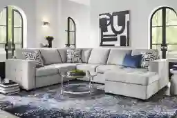 We really love this sofa! The color (blue) has gray undertones in it and looks great in our space. I like that the pillow backs are semi attached (they zipper off) so the back of the sofa won’t slouch over time. The added feature of the pullout cushions are a fun bonus for movie nights. The chaise has storage as well which. Hopefully this couch will last a long time.