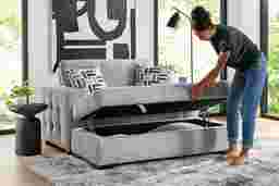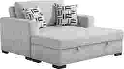 The confident, classy personality of the Geneva collection takes grounded and crowd-pleasing design to stylish new heights. Cutting a unique modern silhouette in textured gray fabric, this chaise offers big, bold track arms with tufting on the sides. The seat features tufting to match, with attached cushions that stay comfortably in place when it's time to grab something out of the handy storage beneath. Stainless steel cupholders and integrated USB-A and C chargers in the arms provide even more convenience close at hand. The adjustable back can be positioned for a comfortable recline or laid all the way down for a comfortable spot to nap. Upholstery: 87% polyester 13% polypropylene