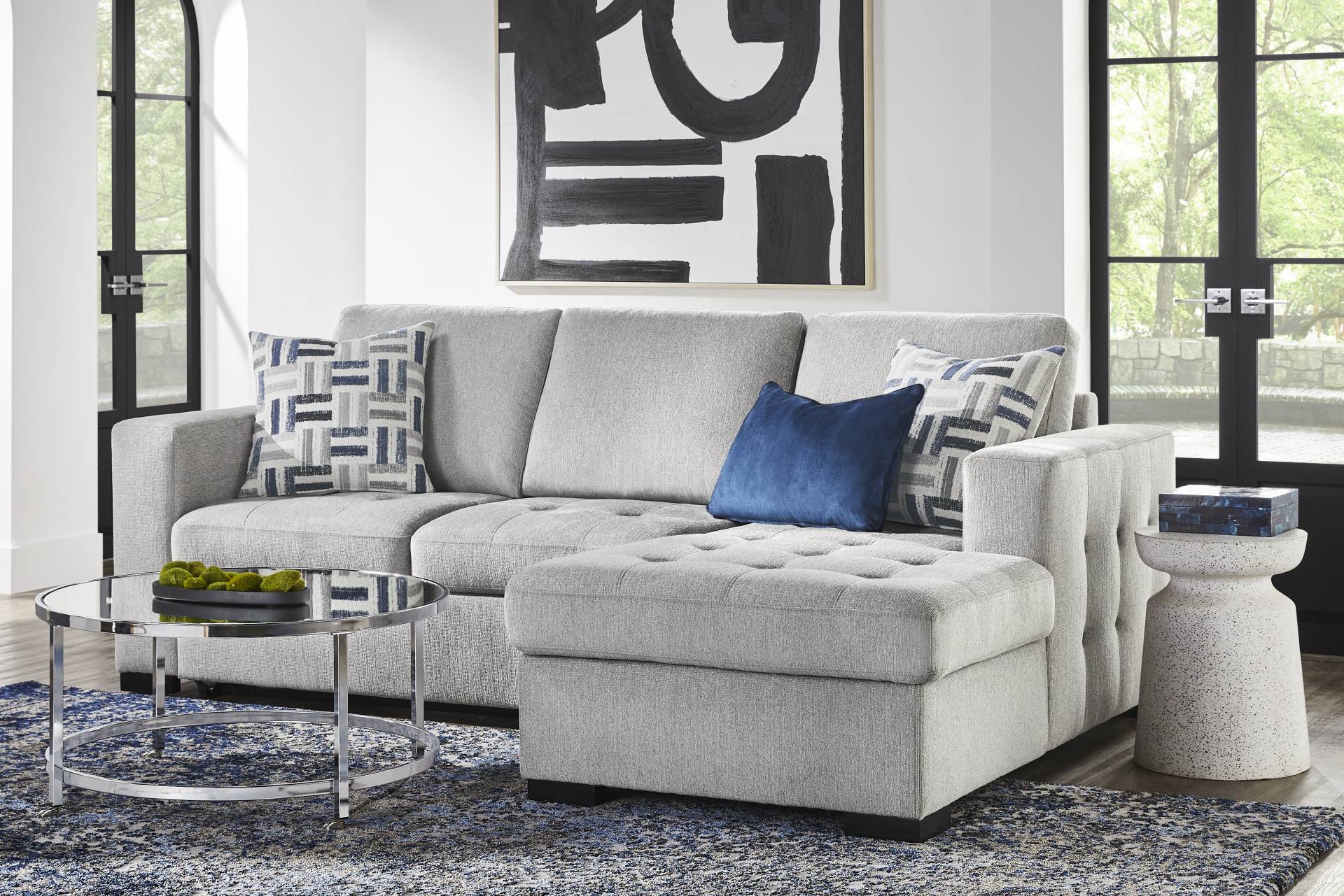 The confident, classy personality of the Geneva sectional takes grounded and crowd-pleasing design to stylish new heights. Cutting a unique modern silhouette in textured gray fabric, this sofa features big, bold track arms with tufting on the sides. The seats feature tufting to match, with attached cushions that stay comfortably in place when it's time for the pop-up sleeper to make its debut for the night. Hidden in the end chaise is a convenient storage space perfect for stowing blankets. Included with the piece, a coordinating set of accent pillows can be rearranged for maximum comfort. Upholstery: 87% Polyester, 13% Polypropylene.