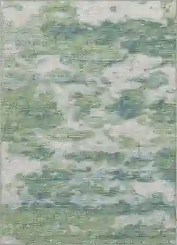 This rug features a sophisticated palette of green, blue, and gray tones in a transitional abstract pattern. To create a cohesive aesthetic, pull the secondary colors—such as the cool blues or neutrals—into your space through accent pillows or decorative vases. Because of its contemporary style, it pairs exceptionally well with sleek, modern silhouettes or transitional furniture pieces, acting as a versatile canvas that bridges various decor styles.