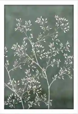 The Gentle Tree II showcases delicate tree branches with white and beige leaves contrast with a mottled green backdrop. Framed in a lacquered white wood shadow box style molding. Mounting hardware included. Customer assembly is required.