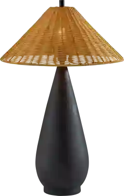 Introducing the Gerisch Shores Black Lamp, a beautiful fusion of modern design and natural texture. Featuring a teardrop-shaped rough-finished black ceramic base, this lamp brings a bold yet refined touch to your decor. The tapered brown rattan shade complements the base with its organic texture, creating a warm and inviting glow. Standing at 28 inches tall, this lamp is ideal for enhancing living rooms, bedrooms, or entryways. Partial assembly may be required.