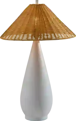 Introducing the Gerisch Shores White Lamp, a stylish combination of natural textures and contemporary design. This lamp features a rough-finished white ceramic base that adds a touch of rustic elegance to your space. The tapered brown rattan shade complements the base with its organic texture, casting a warm and inviting light. Standing at 28 inches tall, this lamp is perfect for enhancing living rooms, bedrooms, or entryways. This lamp effortlessly blends functionality with timeless style. Partial assembly may be required.