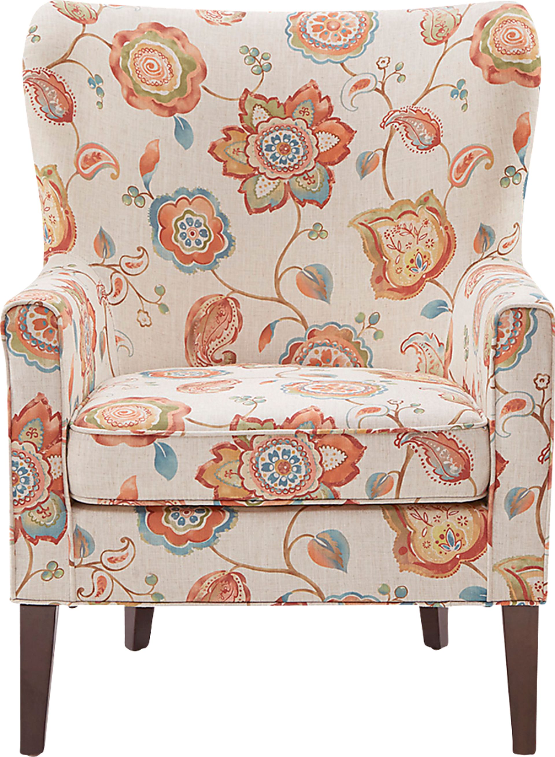 Make a statement in your living room with the Gerod accent chair. The high back and track arms of this stylish accent chair create an elegant silhouette, while the vibrant print adds a splash of color to the cream upholstery. A Moroccan finish on the straight wood legs beautifully complements the transitional look. Accented with silver nail heads, this arm chair features a removable seat cushion and has a maximum weight capacity of 300 lbs. Customer assembly is required.