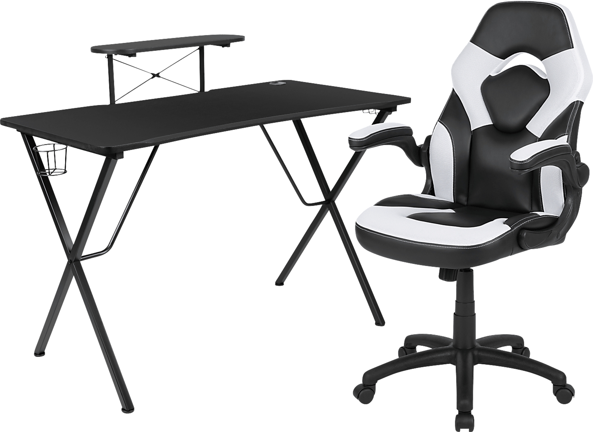 Let the games begin on the Gerro gaming desk and chair set. Not only cool to look at but the raised platform keeps your PC monitor at eye level, reducing neck strain. The black top gamers table has a grommet for cable management, a detachable cup holder and headset holder to keep you in game mode. The racing game chair have flip-up arms to comfortably rest your arms on while handling the controller or flip-up to slide under the desk. Be true to the gaming experience with a desk and chair combo designed for gaming systems. If you need more desk space, remove the platform to accommodate dual monitors. Use the cup holder to prevent beverages from spilling on your pc gaming keyboard. The comfortably padded black and white ergonomic gaming chair has a full swivel cylinder and adjusts with the pneumatic lever. Tilt back with ease by pulling the lever outward, control the force needed to recline by turning the knob underneath the seat. Made for gamers, this gaming desk and chair bundle will get you on your way to leveling up. Customer assembly is required.