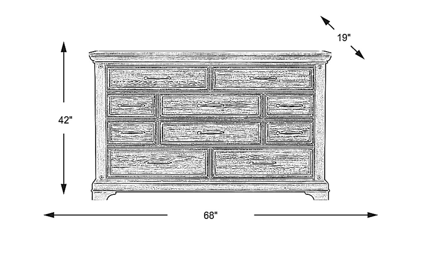 An inviting and surprising casual style sets the tone of every bright morning with the Gillon Ferry dresser. Crafted of wood solids and hickory veneers in a brown finish, this piece features handsome slats on the sides and horizontal bar pulls on the drawers as well as attractive rivet details on each corner. A unique arrangement of 10 drawers amplifies the visual interest of this piece.