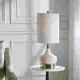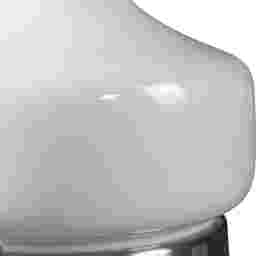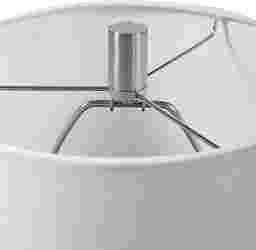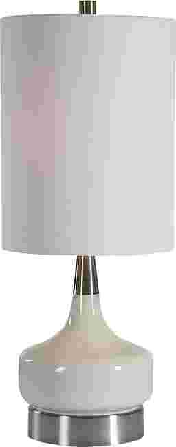 The white, glass base adds to the simplicity of the Gilroy Circle table lamp, which is accented with brushed nickel plated details. The round hardback drum shade is a white linen fabric.