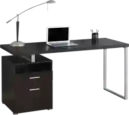 Sleek and contemporary, this rich cappuccino finished Gilsan desk which can be configured on the left or right hand side is the perfect combination of function, durability and design in a modern form. With clean lines, a floating top work station and sleek track metal legs, this piece will add pizzazz to any home office. Featuring an open concept shelf, a storage drawer and a file drawer accented by silver colored drawer pulls to help keep your office supplies and documents organized and desktop clutter free. The large thick paneled surface provides plenty of room to meet your working needs without compromising style. Customer assembly required.