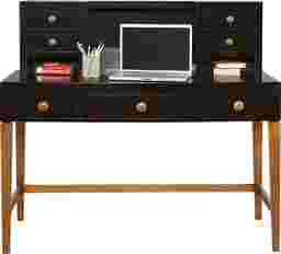 The Gio desk and hutch is a contemporary piece of furniture that will last through the years, yet still remain stylish. Quality constructed of poplar and pine solids with birch veneers, a rich graphite black finish combines beautifully with the light cherry finished base. This piece features four small drawers and two open cubbies on the hutch and two side drawers that flank a keyboard tray. This allows for plenty of space for books, loose paper, pens, and anything else your child needs close by while they study. Light cherry finished wooden knob hardware adds the finishing touch.
