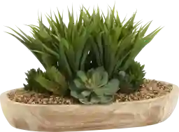 The Gisborne brown silk plant consists of Lily grass, echeveria and succulents in an oval, wooden bowl.
