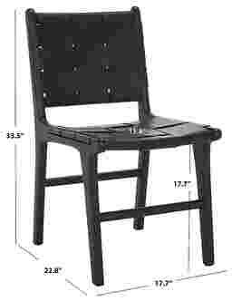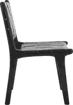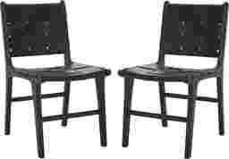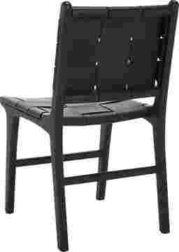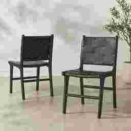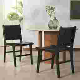 This black Givernola side chair set blends traditional craftsmanship with modern design. Featuring a hand-woven black top grain leather seat and a sturdy teak wood frame, it offers lasting comfort and timeless style. A versatile piece that elevates any dining space. Customer assembly required.