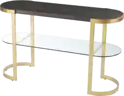 Strike gold with this contemporary Gladden console table. The spacious tabletop provides ample space for family photos and a table lamp, while the clear glass shelf holds potted plants and decor. A gold metal frame curves around the ebony tabletop, crafting a sleek look. Add a focal point to your decor with this elegant console in your entryway or open concept living space. Customer assembly is required.