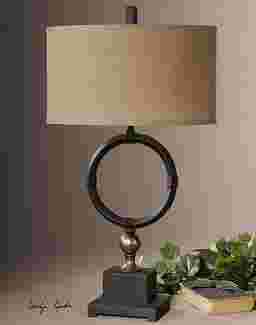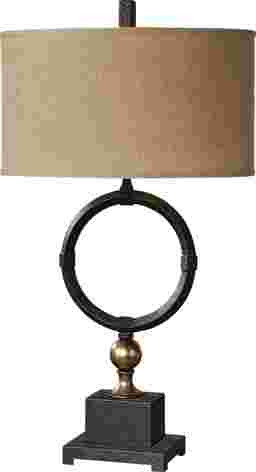 The Glen Wick transitional table lamp has textured rust black metal with antiqued silver champagne accents is the perfect conversation lamp in your home. The oval hardback shade is a burlap linen fabric with natural slubbing. Customer assembly required.