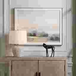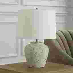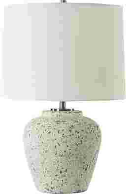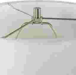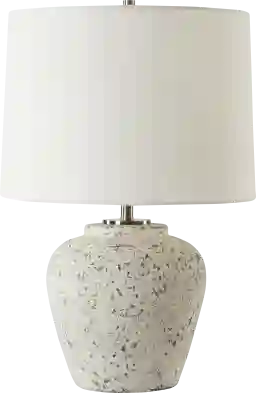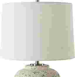 The Glenco Bay Ivory Lamp features a heavily distressed aged ivory finish with stone gray undertones and subtle texture, accented with brushed nickel-plated details. The slightly tapered round hardback shade is a crisp white linen fabric. Partial assembly may be required.