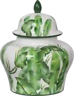 This wide Goethals II green jar features a classic shape with carefully painted palm leaves for a graceful, sleek look that complements a variety of spaces. Add this piece to a tropical sunroom, beach house kitchen, or airy master bathroom.