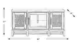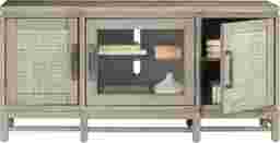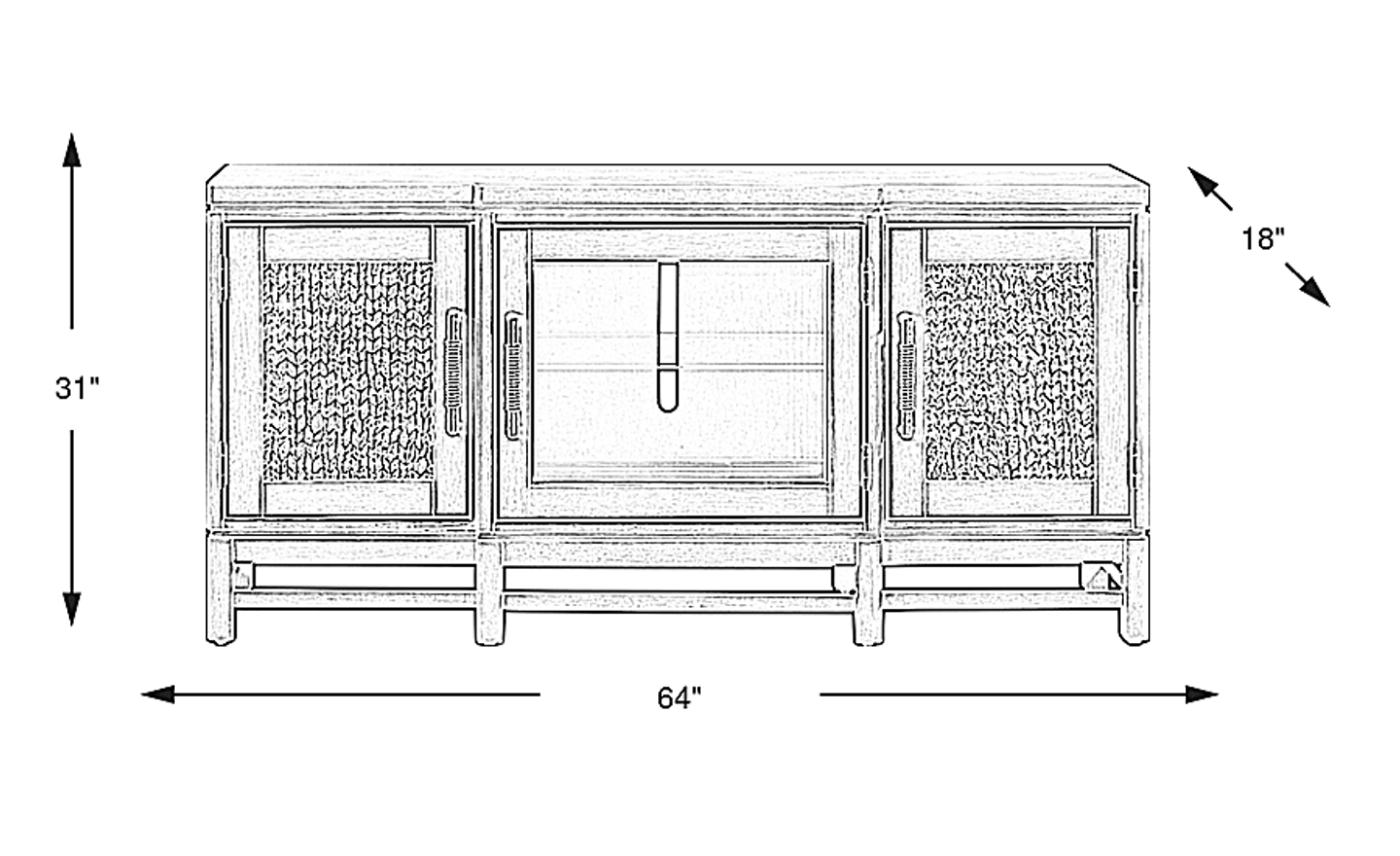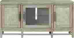 The coastal ambiance and rich textures of the Golden Isles collection add a visually peaceful and calming serenity. Crafted of wood solids and quarter cut ash veneers in a gray finish, this 64-inch console is equipped with a center display case with two shelves for décor, media players and more. Each end of the console has additional storage hidden behind doors that feature tropical woven details, accenting the piece with stunning seaside appeal. Convenient wire management holes are located on the rear panel of the case. Oversized zinc handles in a polished pewter finish deliver the perfect final touch.