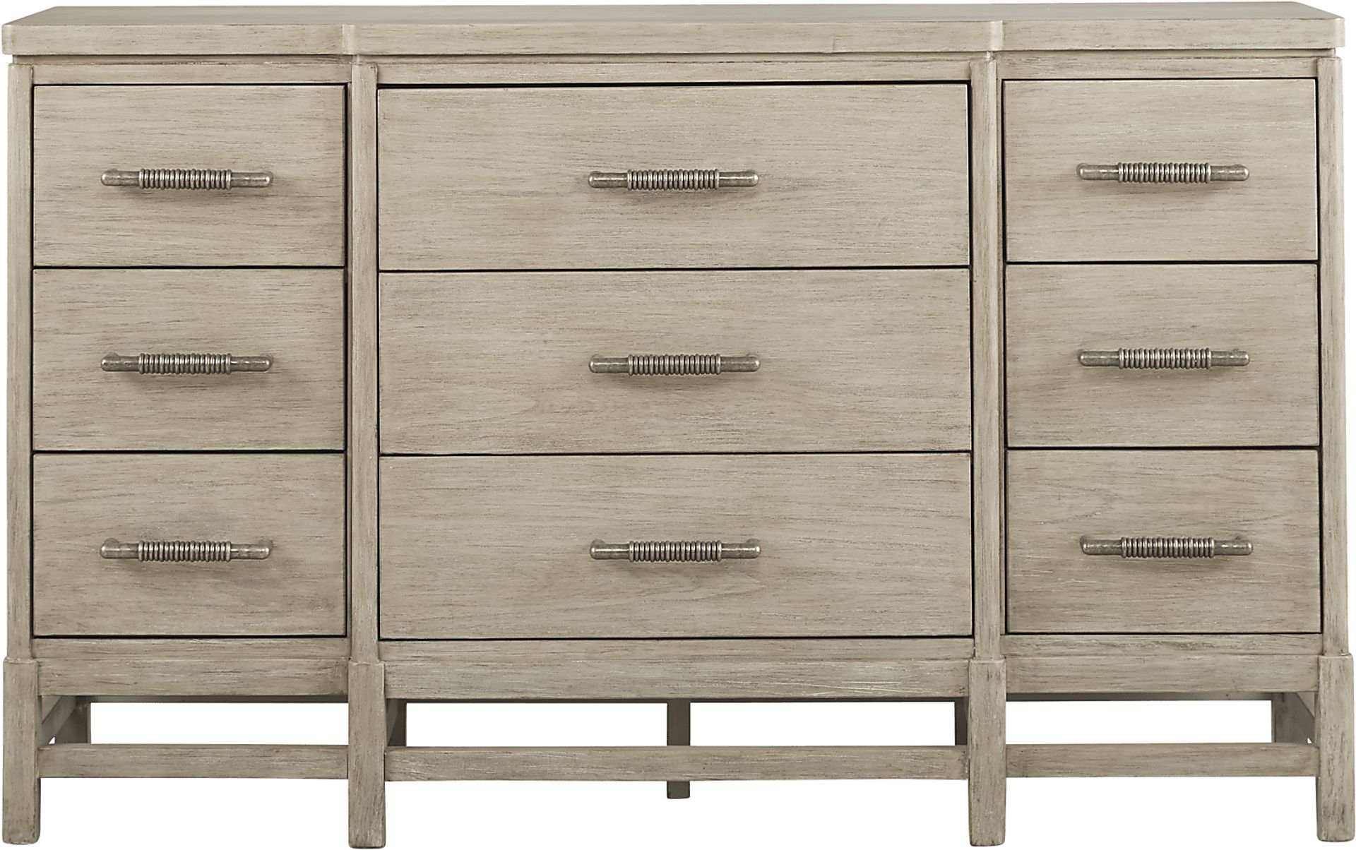 Keep everyday necessities neatly organized with the Golden Isles dresser. Boasting relaxed styling epitomized by a gray finish, this piece encompasses nine large storage drawers including pewter finished hardware. For stability and strength each drawer is made with English dovetail joints. Long lasting quality is ensured by sturdy poplar solids and Mindy veneers.