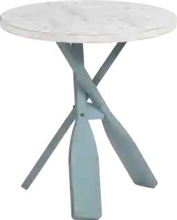 Embrace coastal romance with the Goldpsire white accent table. Crafted from fir wood, its white top with brown undertones exudes rustic charm. Supported by three paddle-shaped legs in a light aqua finish, its distressed look adds character and allure. Let this table be the perfect addition to infuse your space with coastal-inspired elegance and timeless romance. Customer assembly is required.