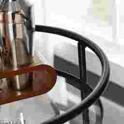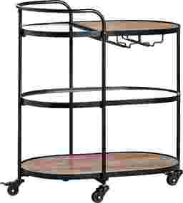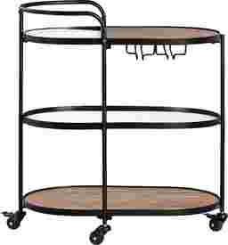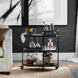 Designed for convenience, the Goltra black bar cart is equipped with casters that ensure effortless movement, allowing you to transport your libations and essentials from room to room with ease. The inclusion of a dedicated metal holder for wine glasses keeps your stemware organized and easily accessible, adding a functional yet elegant touch. Customer assembly is required.