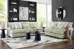 Timeless sophistication and the refreshing essence of a new day blend seamlessly in the Goodwin loveseat, exuding soothing charm with its poised curves, soft textures, and inviting comfort. Upholstered in textured gray boucle, this transitional piece features elegant roll arms, welted seams and billowy cushions for a relaxed yet refined silhouette. Reversible back and seat cushions can be easily removed for effortless cleaning, ensuring a fresh and polished look for years to come. The seat cushions feature a plush custom blend of feathers, fiber and down surrounding a supportive foam core for comfort that’s soft yet structured. Complementing accent pillows add an extra layer of style with their harmonious patterns, while square, block legs finished in black perfectly complete the set. Upholstery: 100% Polyester.