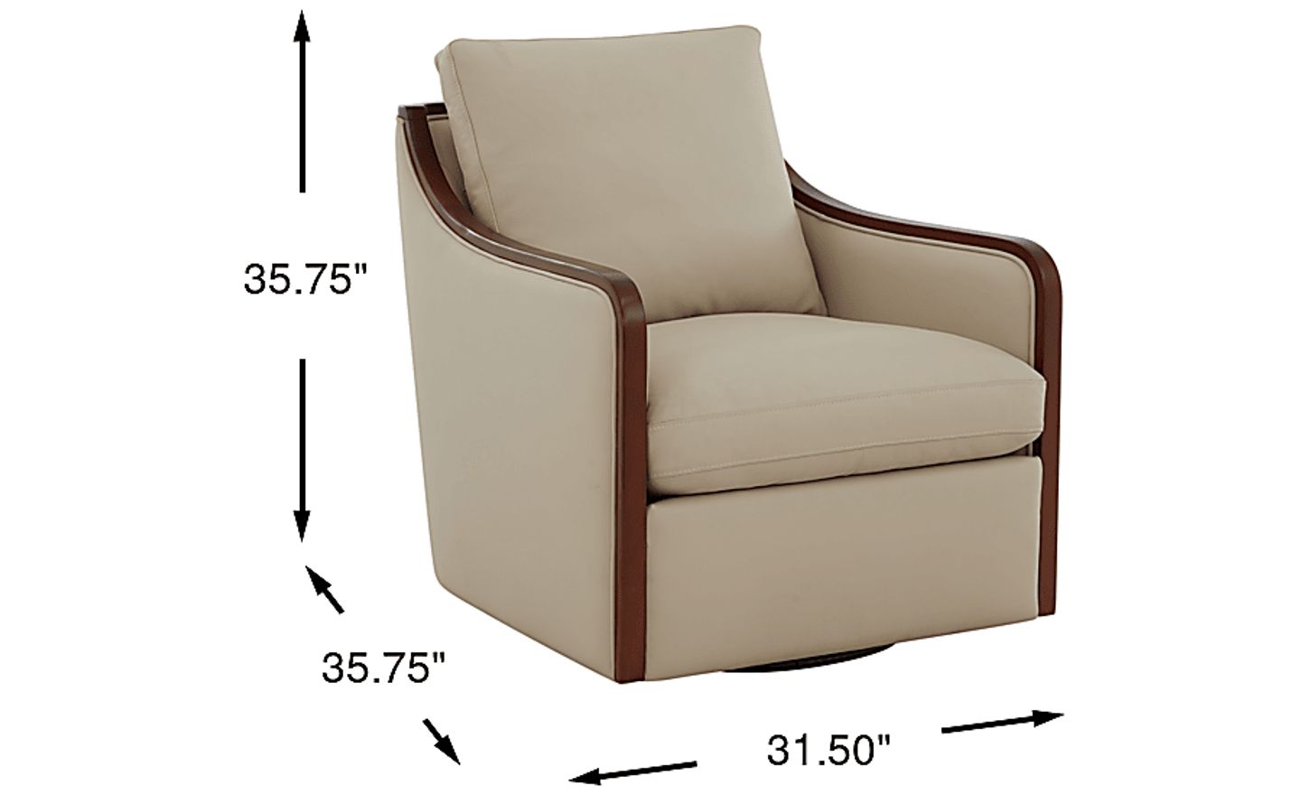 Grounded elegance and indulgent luxury ease the mind and comfort the body as the Gordon swivel chair's calming presence flows effortlessly from its sculptural lines and irresistible texture. Upholstered in beige top grain leather where the body touches, this traditional piece's plush seat and back cushions invite you to unwind comfortably. Gently sloped track arms framed by rich brown accent panels bring a refined structure to its soft silhouette. The smooth 360-degree swivel chair adds seamless movement, keeping you engaged while you're hosting, relaxing or simply enjoying the moment. Upholstery: Top grain leather where the body touches and polyurethane fabric sides and backs. Leather is a durable, low maintenance product, however, general regular maintenance is necessary. To keep your leather clean, vacuum it regularly, removing any dust, and clean it with water and a mild non-detergent soap.