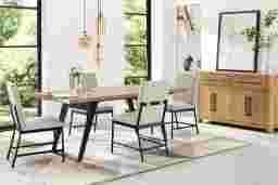 Like morning light filtering through the kitchen window, the Grand Falls dining collection brings the feeling of natural warmth indoors and offers a welcoming space for shared meals. Contemporary in style, this dining side chair features a fully upholstered back and seat wrapped in soft beige fabric and sleek black legs that add stylish contrast and striking visual balance. Straight lines and low-profile footrests on the sides and back further enhance the refined, modern look, creating an experience that's equal parts inviting and elevated.