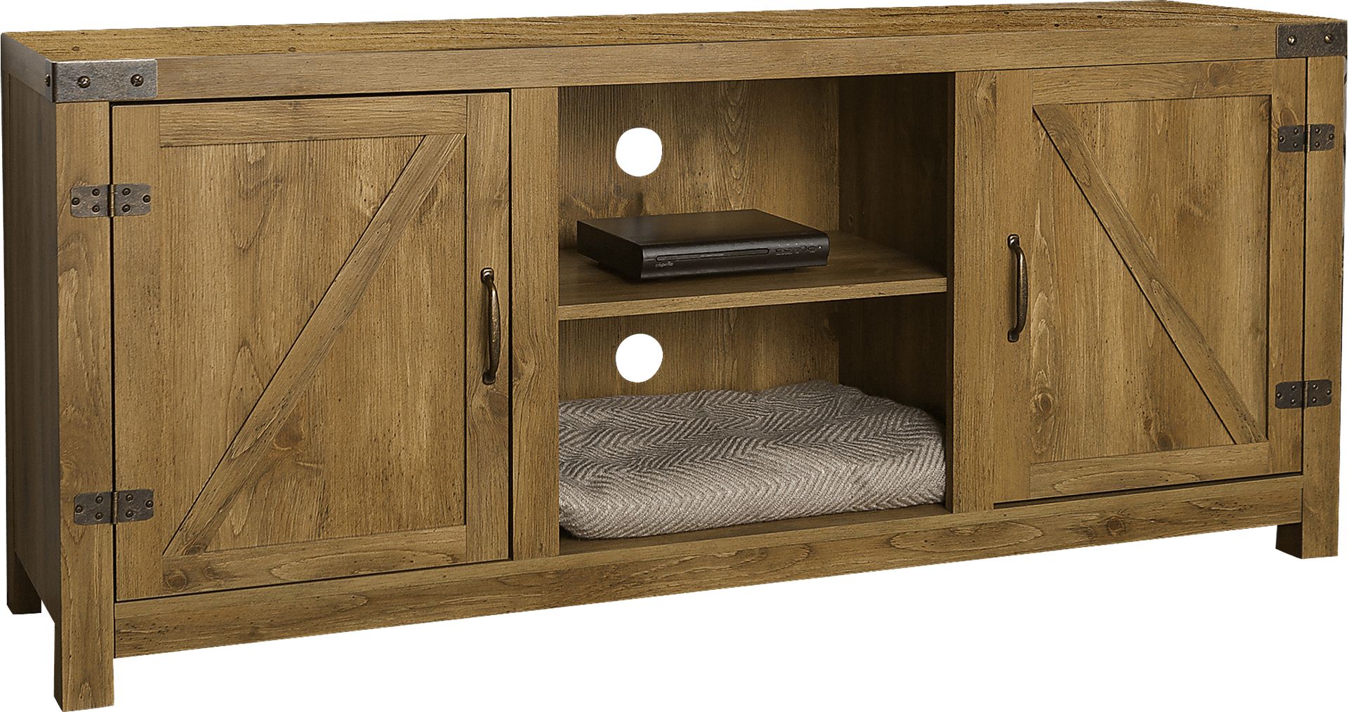 The Granger brown 58 in. console not only enhances the decor of your living area with its rustic barn door style, but it also creates ample storage for all of your media, accessories, and more. Constructed of high-grade laminate, this durable long lasting stand supports most TVs up to 65 in. It's the perfect addition that will keep your living room looking neat and give it a homespun feel. Customer assembly required.