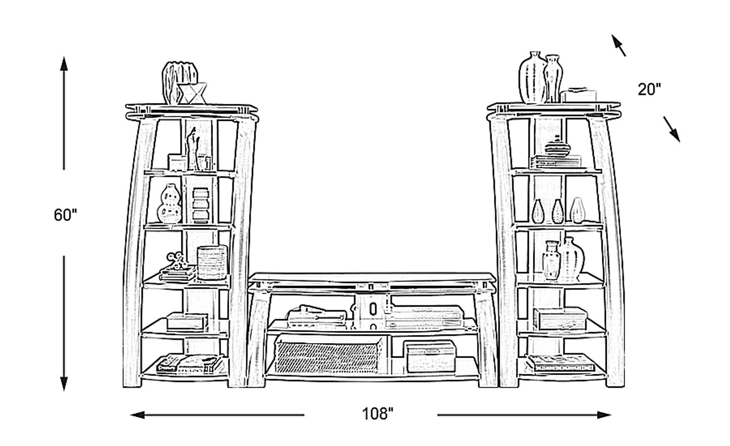 With its contemporary arched design, chic gray finish and open storage, the Grant City II wall unit is an excellent choice. The console features black glass shelves and decorative silver accents while matching piers have additional storage and display shelves. A wire management system on the back panel keeps cords tucked neatly out of view. Customer assembly required.