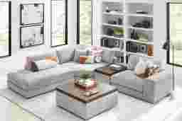 Discover the unlimited possibilities of the Drew & Jonathan ModularThree collection, thoughtfully designed to deliver the utmost in comfort and flexibility. Contemporary in style and upholstered in rich gray chenille, the tailored look of this innovative seating solution is accentuated by deep lounge seats offering the indulgent luxury of ultra-comfortable custom feather, fiber and down blend cushions. Each piece is upholstered on all sides, creating endless opportunities for reconfiguration and individual use. The extra-large console features a reading light, retracting USB hub and a bluetooth-enabled speaker magnetically mounted to a wireless charger. Under the console's sliding wood-top table is maximum space for storage of even the bulkiest relaxation essentials. Select a preconfigured design or visit a showroom to learn about individual components and create the modular solution perfect for your space and style. Includes RAF chair, 1 media console, 1 wedge and 1 LAF chaise. Upholstery: 100% Polyester.
