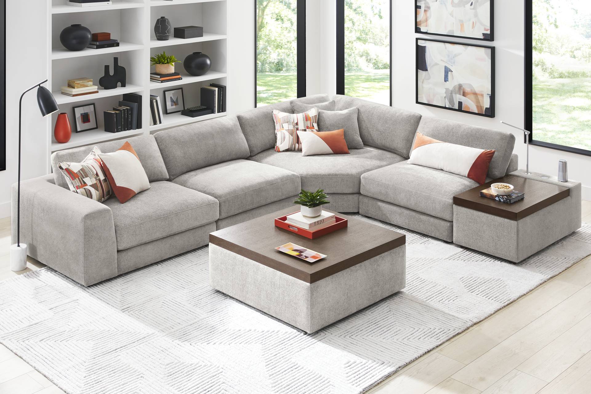Discover the unlimited possibilities of the Drew & Jonathan ModularThree collection, thoughtfully designed to deliver the utmost in comfort and flexibility. Contemporary in style and upholstered in rich gray chenille, the tailored look of this innovative seating solution is accentuated by deep lounge seats offering the indulgent luxury of ultra-comfortable custom feather, fiber and down blend cushions. Each piece is upholstered on all sides, creating endless opportunities for reconfiguration and individual use. The extra-large console features a reading light, retracting USB hub and a bluetooth-enabled speaker magnetically mounted to a wireless charger. Under the console's sliding wood-top table is maximum space for storage of even the bulkiest relaxation essentials. Select a preconfigured design or visit a showroom to learn about individual components and create the modular solution perfect for your space and style. Includes LAF chair, 1 media console, 2 armless chairs and 1 wedge. Upholstery: 100% Polyester.