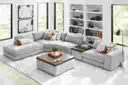 Discover the unlimited possibilities of the Drew & Jonathan ModularThree collection, thoughtfully designed to deliver the utmost in comfort and flexibility. Contemporary in style and upholstered in rich gray chenille, the tailored look of this innovative seating solution is accentuated by deep lounge seats offering the indulgent luxury of ultra-comfortable custom feather, fiber and down blend cushions. Each piece is upholstered on all sides, creating endless opportunities for reconfiguration and individual use. The extra-large console features a reading light, retracting USB hub and a bluetooth-enabled speaker magnetically mounted to a wireless charger. Under the console's sliding wood-top table is maximum space for storage of even the bulkiest relaxation essentials. Select a preconfigured design or visit a showroom to learn about individual components and create the modular solution perfect for your space and style. Includes RAF chair, 1 media console, 1 armless chair, 1 wedge and 1 LAF chaise. Upholstery: 100% Polyester.