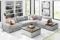 Discover the unlimited possibilities of the Drew & Jonathan ModularThree collection, thoughtfully designed to deliver the utmost in comfort and flexibility. Contemporary in style and upholstered in rich gray chenille, the tailored look of this innovative seating solution is accentuated by deep lounge seats offering the indulgent luxury of ultra-comfortable custom feather, fiber and down blend cushions. Each piece is upholstered on all sides, creating endless opportunities for reconfiguration and individual use. The extra-large console features a retracting USB hub for convenient charging. Under the console's sliding wood-top table is maximum space for storage of even the bulkiest relaxation essentials. Select a preconfigured design or visit a showroom to learn about individual components and create the modular solution perfect for your space and style. Includes LAF chair, 1 console, 2 armless chairs and 1 wedge. Upholstery: 100% Polyester.
