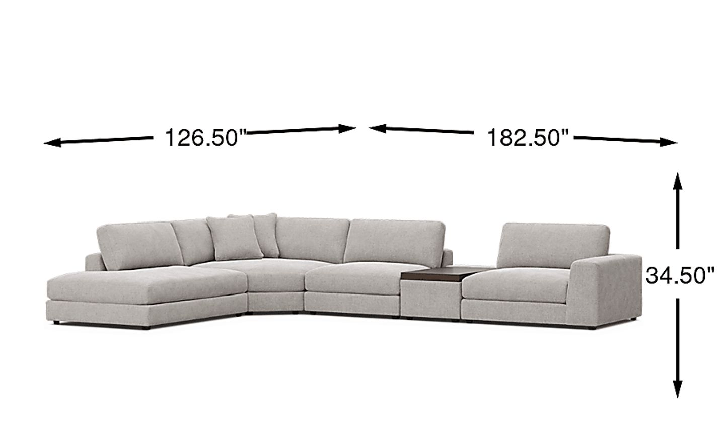 Discover the unlimited possibilities of the Drew & Jonathan ModularThree collection, thoughtfully designed to deliver the utmost in comfort and flexibility. Contemporary in style and upholstered in rich gray chenille, the tailored look of this innovative seating solution is accentuated by deep lounge seats offering the indulgent luxury of ultra-comfortable custom feather, fiber and down blend cushions. Each piece is upholstered on all sides, creating endless opportunities for reconfiguration and individual use. The extra-large console features a retracting USB hub for convenient charging. Under the console's sliding wood-top table is maximum space for storage of even the bulkiest relaxation essentials. Select a preconfigured design or visit a showroom to learn about individual components and create the modular solution perfect for your space and style. Includes RAF chair, 1 console, 1 armless chair, 1 wedge and 1 LAF chaise. Upholstery: 100% Polyester.