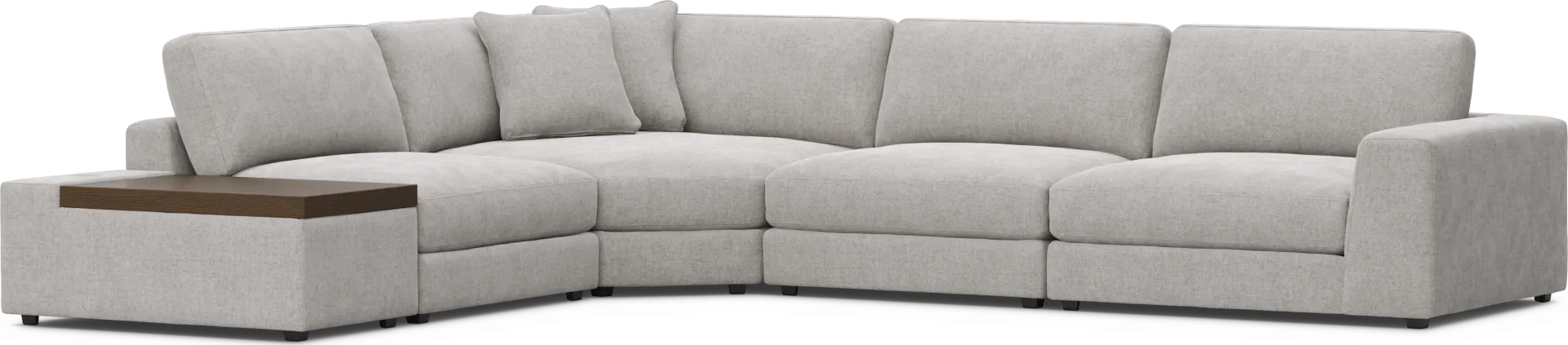 Discover the unlimited possibilities of the Drew & Jonathan ModularThree collection, thoughtfully designed to deliver the utmost in comfort and flexibility. Contemporary in style and upholstered in rich gray chenille, the tailored look of this innovative seating solution is accentuated by deep lounge seats offering the indulgent luxury of ultra-comfortable custom feather, fiber and down blend cushions. Each piece is upholstered on all sides, creating endless opportunities for reconfiguration and individual use. The extra-large console features a retracting USB hub for convenient charging. Under the console's sliding wood-top table is maximum space for storage of even the bulkiest relaxation essentials. Select a preconfigured design or visit a showroom to learn about individual components and create the modular solution perfect for your space and style. Includes RAF chair, 1 console, 2 armless chairs and 1 wedge. Upholstery: 100% Polyester.