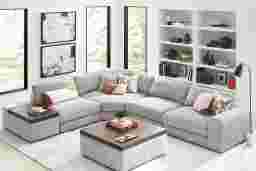 Discover the unlimited possibilities of the Drew & Jonathan ModularThree collection, thoughtfully designed to deliver the utmost in comfort and flexibility. Contemporary in style and upholstered in rich gray chenille, the tailored look of this innovative seating solution is accentuated by deep lounge seats offering the indulgent luxury of ultra-comfortable custom feather, fiber and down blend cushions. Each piece is upholstered on all sides, creating endless opportunities for reconfiguration and individual use. The extra-large console features a retracting USB hub for convenient charging. Under the console's sliding wood-top table is maximum space for storage of even the bulkiest relaxation essentials. Select a preconfigured design or visit a showroom to learn about individual components and create the modular solution perfect for your space and style. Includes RAF chair, 1 console, 2 armless chairs and 1 wedge. Upholstery: 100% Polyester.