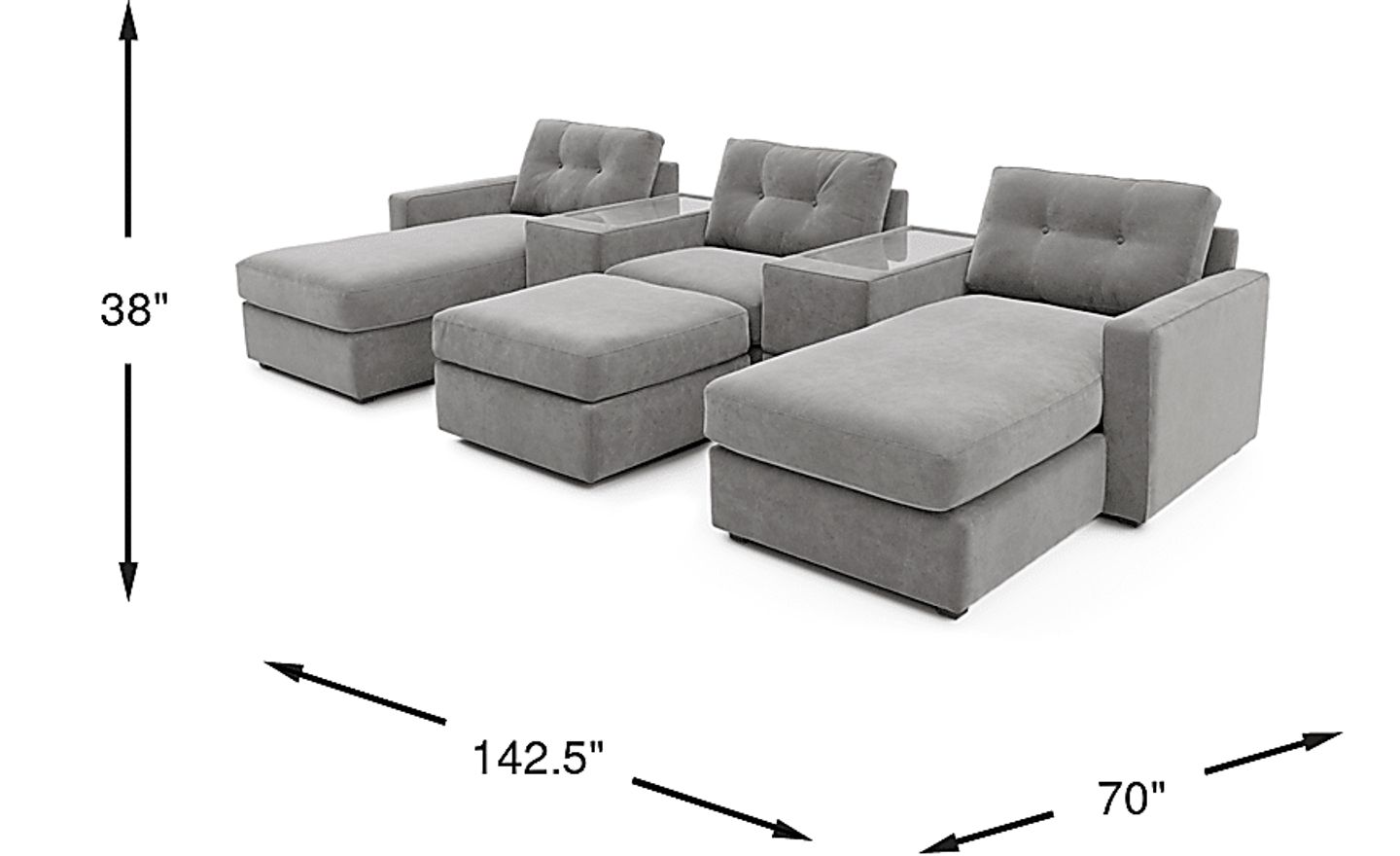 This configuration is thoughtfully equipped for modern entertainment, featuring two center consoles that serve multiple purposes. Each console offers hidden storage for essentials like remotes, chargers, or tablet devices, helping you maintain a clutter-free environment. Additionally, the consoles feature sleek acrylic tops that act as durable side tables, providing a stable surface for beverages and snacks during game days or movie nights.