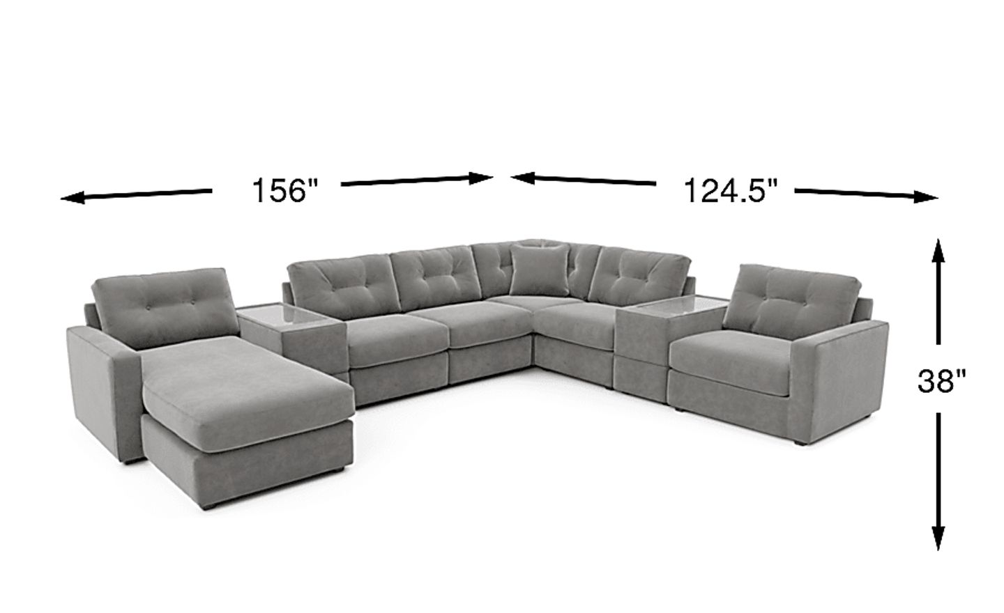 Discover the limitless possibilities of the Drew & Jonathan ModularOne, thoughtfully designed with comfort and flexibility in mind. This customizable seating solution features individual pieces that can be configured to any shape your room needs - the seating arrangement you want is always right at your fingertips. Each individual piece is upholstered on all sides in our signature fabric, New Horizon. This soft, gray chenille includes Repreve yarn, made with recycled plastic bottles. The seating area has welted track arms, top-stitched seat cushions and button-tufted back cushions for an elegant silhouette. Seats with power reclining functionality allow for easy adjustment of the footrest, providing the ultimate in personalized comfort. Two consoles provide hidden storage and double as side tables with sleek acrylic tops. Includes LAF chaise, 2 consoles, armless power recliner, 2 armless chairs, wedge, and RAF power recliner. Upholstery: 100% Polyester.