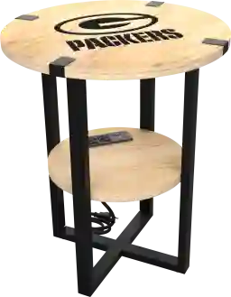 The Green Bay Packers laser etched round side table features a modern design that seamlessly blends with various decorative styles. It offers a convenient functionality for charging up to four devices at one time. The 2-Tier shelf also provides ample space to store your TV remote and other small items. Whether you are a Packers fan or simply appreciate well-crafted furniture, this side table is a versatile addition to any room. Customer assembly is required.