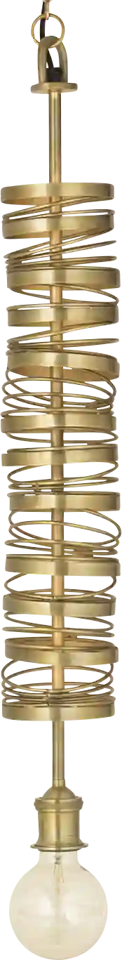 The Greeenleaf Lane with rings of metal in a soft brass finish, stacked like a bangle bracelet with an exposed bulb drop light. Installation recommended by a professional electrician.