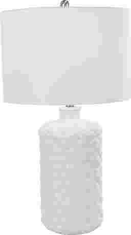 The Greve White Lamp is inspired by blissful serenity and the allure of the sea, where soothing hues and natural textures bring effortless charm to the home. This table lamp is crafted from high-quality ceramic, plastic, and linen material, combining elegance and functionality to create a stylish lighting solution. It features a glossy white finish with silver hardware that adds elegance to any space. This lamp includes a drum linen shade, providing soft and diffused lighting. Partial assembly may be required.