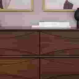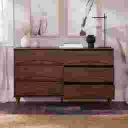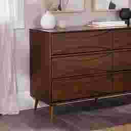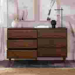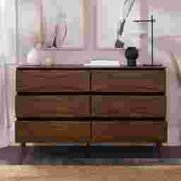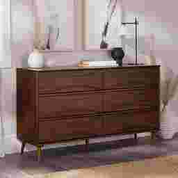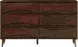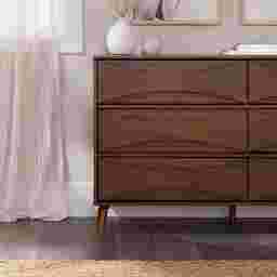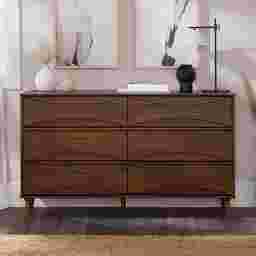 Unmistakably mid-century modern, this Grevilla dresser will boldly make a statement, whether you use it for added storage in the living room, TV room, or your bedroom. Six spacious drawers lend a look of retro-inspired flair with their curved, beveled detail, as well as modern functionality with their spacious interiors and smooth solid wood glides. Sleek, hardware-free drawer pulls add an element of classic modernity to the piece, while its durable, responsibly sourced solid wood build and included anti-tip kit ensure that this sustainably stylish piece remains a staple in your abode for years. Customer assembly is required.