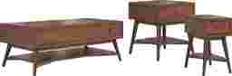 Refined with a smart mix of curves and lines, the Greyson table set showcases style that lands just right in the lounge, the study, or the living room. The rich brown finish of this midcentury collection is complemented by bright metal knobs on the convenient drawers. A section of the cocktail table's top lifts to reveal a storage space perfectly sized to fit laptops, books and more. The four turned, tapered legs of each piece hold a shelf on top of their crossed supports to finish the look. Customer assembly required.