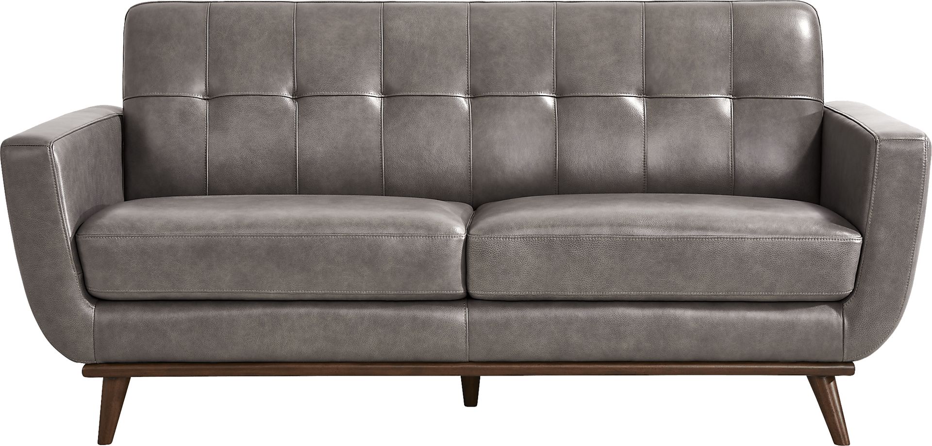 Refined with a smart mix of curves and lines, the Greyson loveseat showcases style that lands just right in the lounge, the study, or the living room. Exquisitely modern, this seat's midcentury pedigree shines through in its distinct u-shaped frame, wood base in a light walnut finish, and canted tapered legs. Upholstered in gray top grain leather where the body touches, stylish details include track arms, biscuit-tufted backs, and top-stitched seams throughout. Upholstery:Top grain leather where the body touches with polyurethane sides and backs.