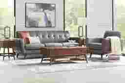 Refined with a smart mix of curves and lines, the Greyson sofa showcases style that lands just right in the lounge, the study, or the living room. Exquisitely modern, this seat's midcentury pedigree shines through in its distinct u-shaped frame, wood base in a light walnut finish, and canted tapered legs. Upholstered in gray top grain leather where the body touches, stylish details include track arms, biscuit-tufted backs, and top-stitched seams throughout. Upholstery:Top grain leather where the body touches with polyurethane sides and backs.