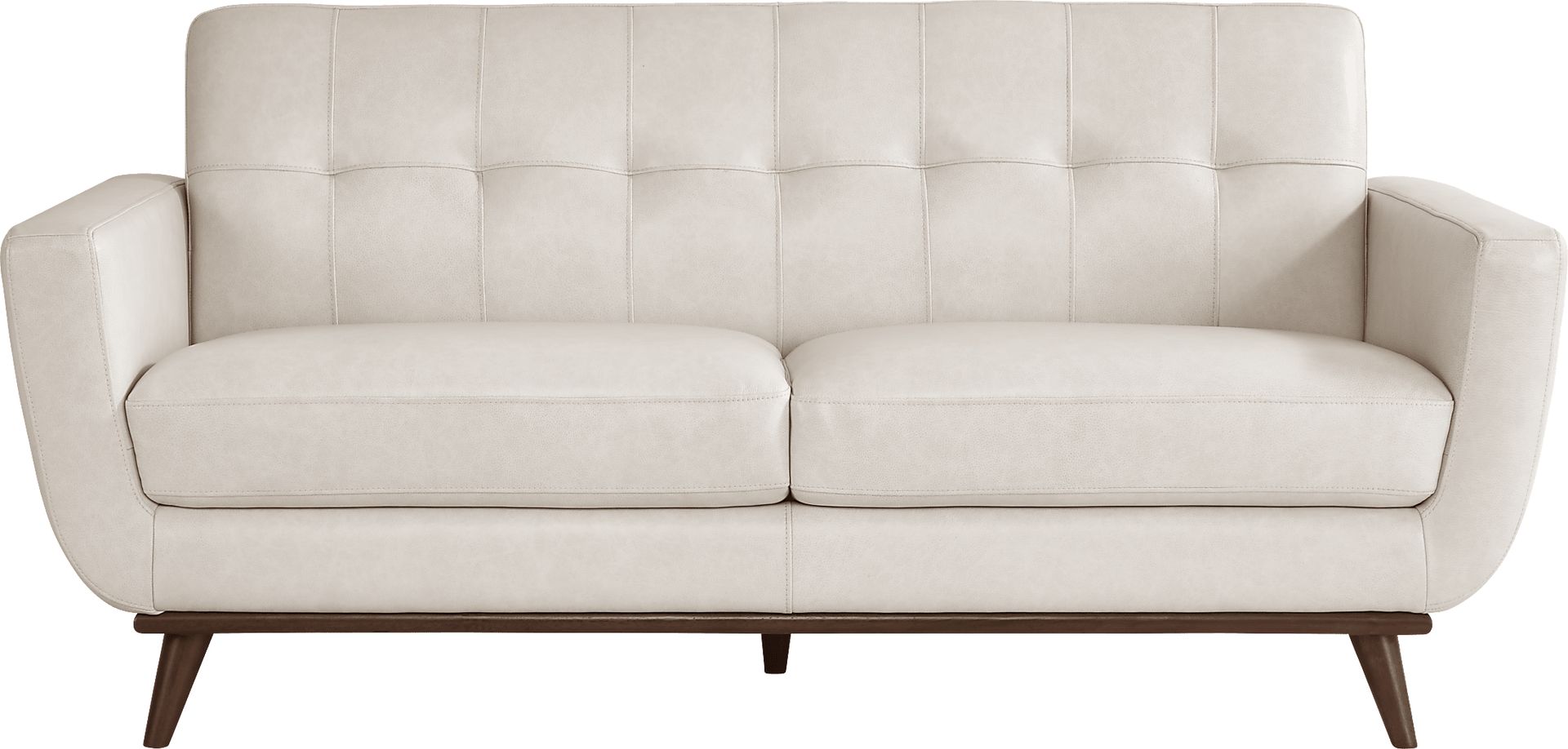 Refined with a smart mix of curves and lines, the Greyson loveseat showcases style that lands just right in the lounge, the study, or the living room. Exquisitely modern, this seat's midcentury pedigree shines through in its distinct u-shaped frame, wood base in a light walnut finish, and canted tapered legs. Upholstered in ivory white top grain leather where the body touches, stylish details include track arms, biscuit-tufted backs, and top-stitched seams throughout. Upholstery: Top grain leather where the body touches and polyurethane fabric sides and backs. Leather is a durable, low maintenance product; however, general regular maintenance is necessary. To keep your leather clean, vacuum it regularly, removing any dust, and clean it with water and a mild non-detergent soap.