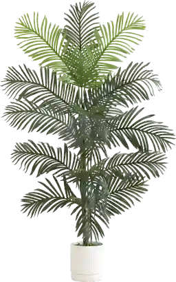 This tree is specifically designed for Coastal and tropical-themed interiors. Its swaying green fronds and natural-looking planter pair exceptionally well with light-colored palettes—such as whites, creams, and seafoam blues—and organic textures like jute rugs or light wood accent tables. It serves as an ideal organic focal point for creating a tranquil, beach-inspired atmosphere.