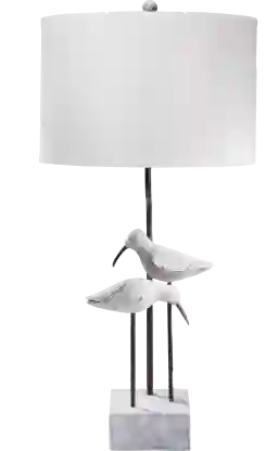 The Grosalia Bay lamp features black stems holding white seagulls on a faux concrete base. Topped with a white linen shade, this niche lamp gives a clean costal vibe to your beach home. Partial assembly may be required.