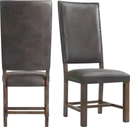 The Grottogate Walnut Side Chair Set will look great in your dining room. These chairs feature a faux leather upholstered seat and back in a rich, chocolate color. The faux leather is distressed, instantly adding character and charm to this chair duo. Slate, nail head trim outlines the back and seat of the chairs, instantly adding extra flair to this already stylish set. The foam cushion seat and back will keep you plenty comfy during even the longest of dinners. The natural wood grains and warm, walnut finish complete the look. Customer assembly required.